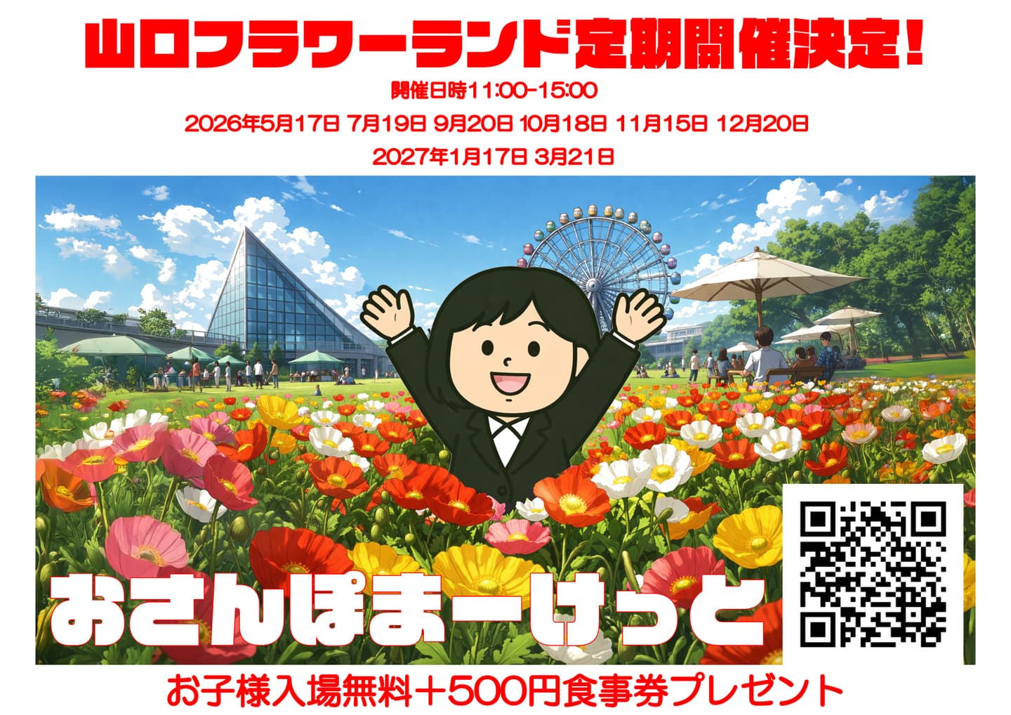 やまぐちフラワーランドでは、毎月第3日曜日に子育て応援企画を実施しています。当日は、中学生以下のお子さまの入園料が無料となるほか、フード屋台(キッチンカー等)で利用できるチケット「こども食事券(500円分)」を先着100名に配布します。
