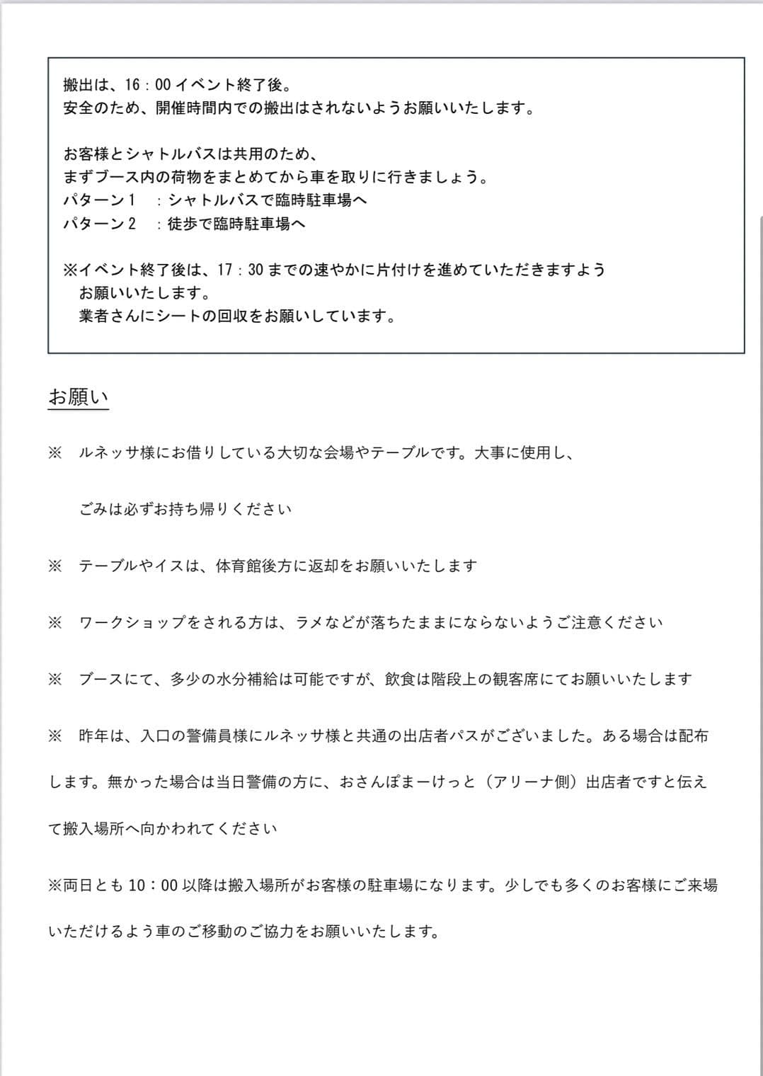1日目:16:00には退場されますので、1日のみのご出店者様から優先的にシャトルバスに乗って車を取りに向かわれてください。