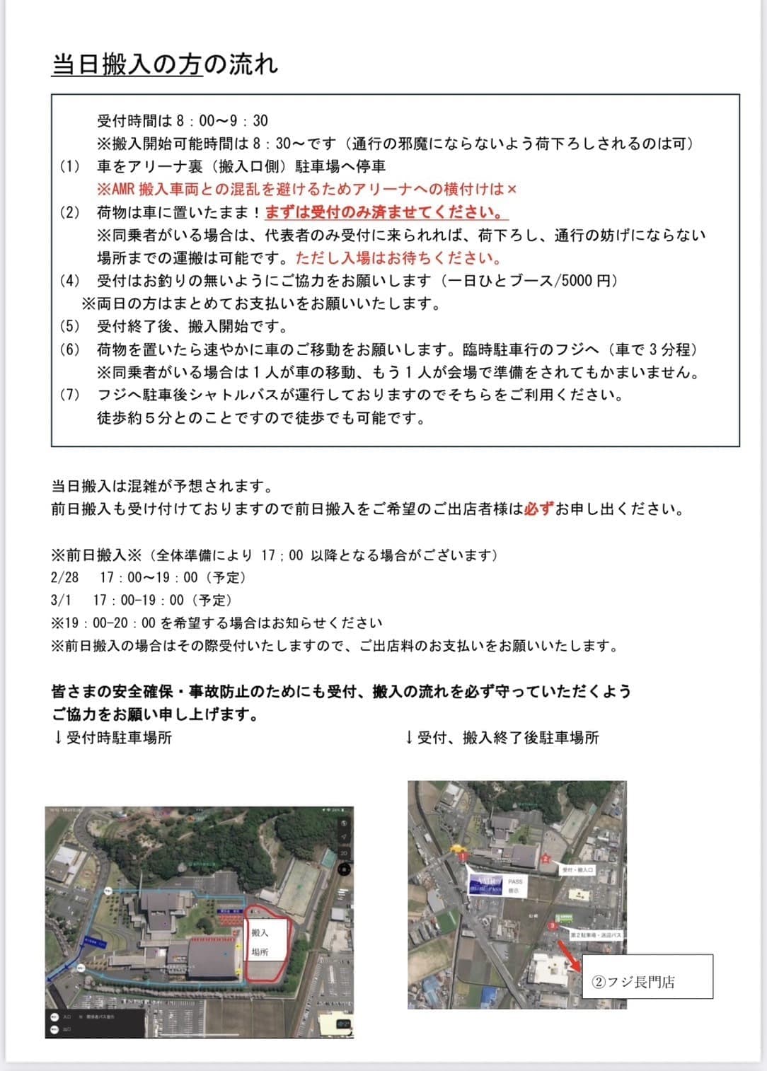 主催さまのご厚意により、シャトルバスが臨時駐車場「フジ長門店」から運行いたしますので、搬入終了後はそちらへ車のご移動願います。