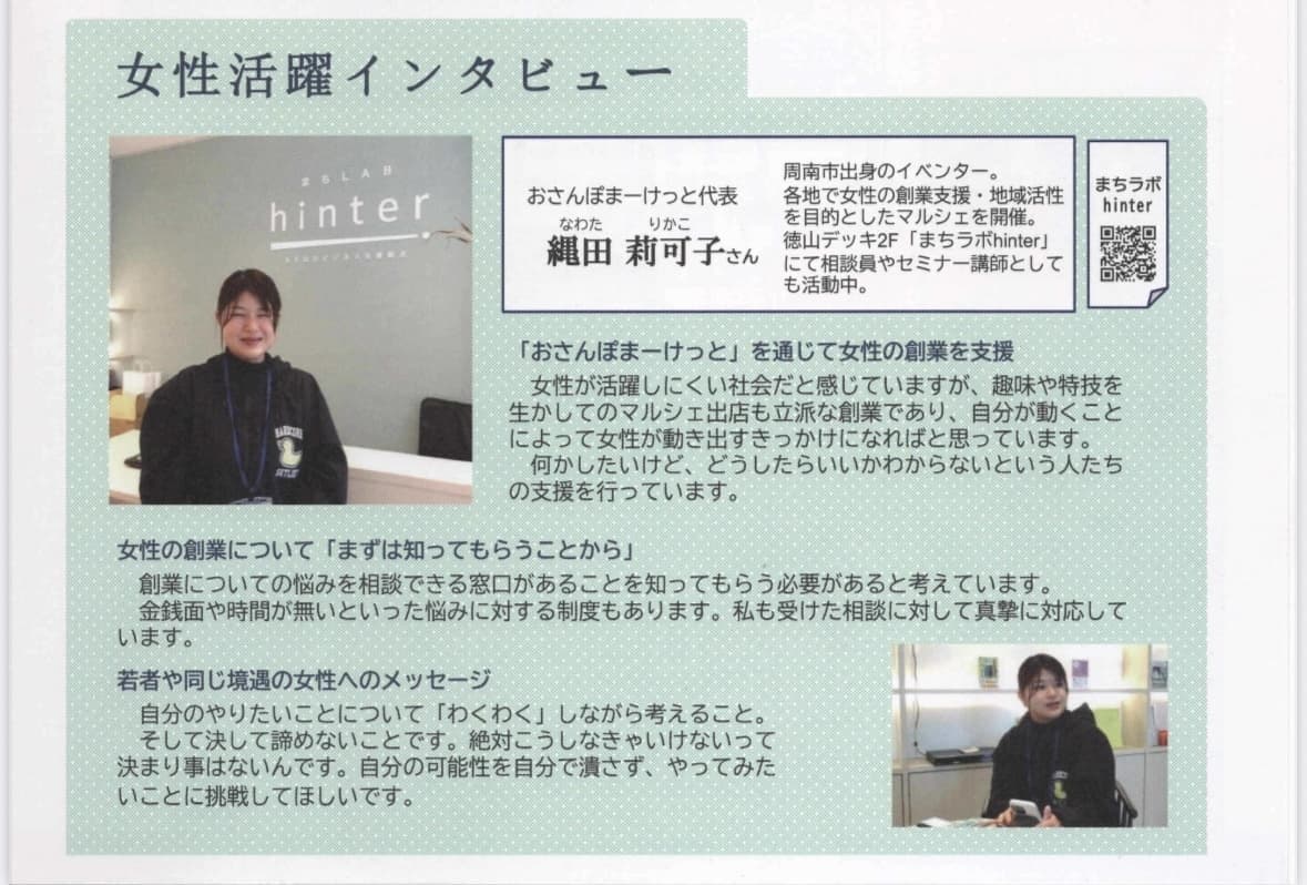 TOKUYAMA DECK D1創業支援まちラボヒンターの専門人材として毎週金曜日に皆様からのご相談を受け付けております。マルシェに出店したい方、周南市内で創業を目指している方、お気軽にご相談ください